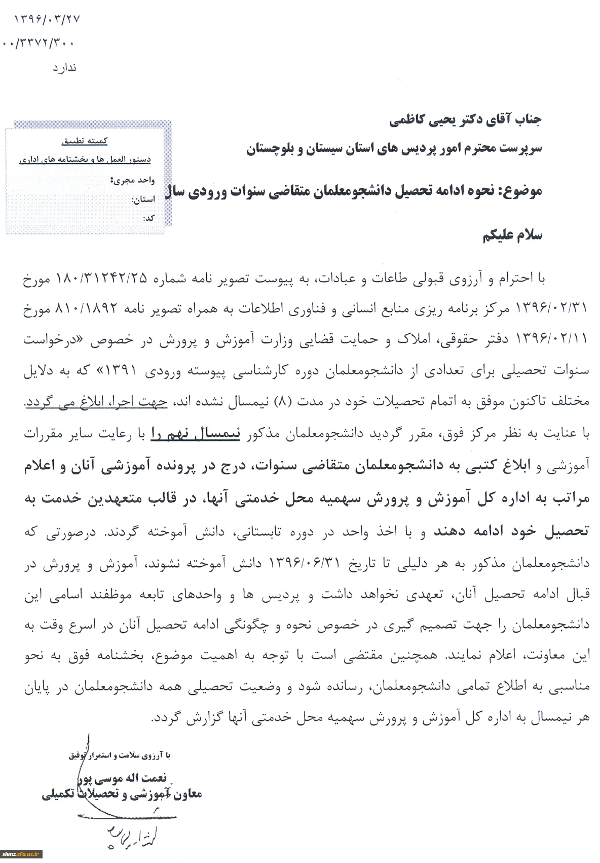 امتیاز دهید : نحوه ادامه تحصیل دانشجو معلمان متقاضی سنوات وردی سال91 2 سهشنبه 30 خرداد 1396 ساعت 13:17